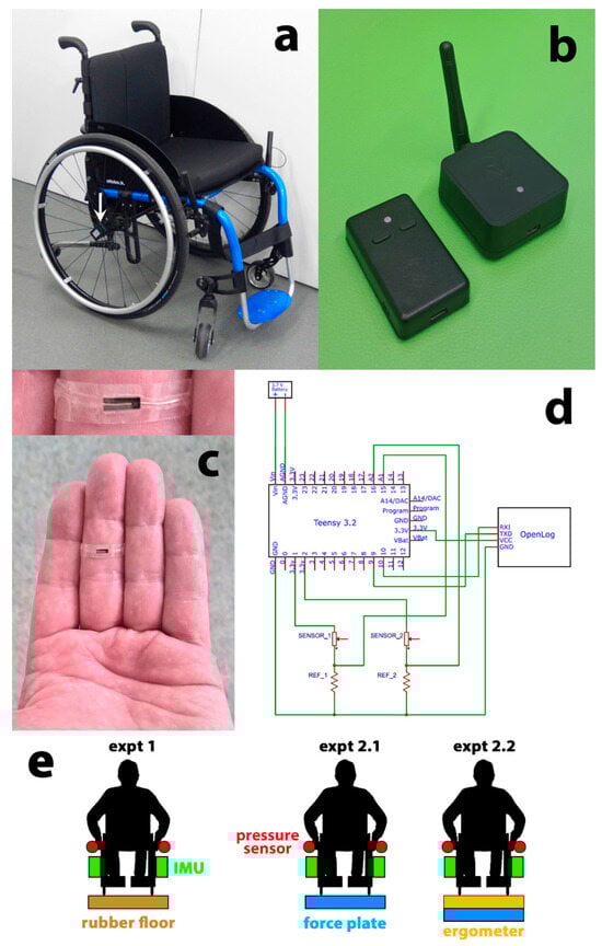 Wheelchair and measurement system; (a) Ventus wheelchair with sensor (white arrow) mounted on the wheel hub; (b) wireless IMU (left) and receiver with antenna (right); (c) miniaturised pressure sensor mounted on the middle finger; (d) circuit diagram of the pressure sensors; (e) equipment (colour coded) used in the different experiments (expt).