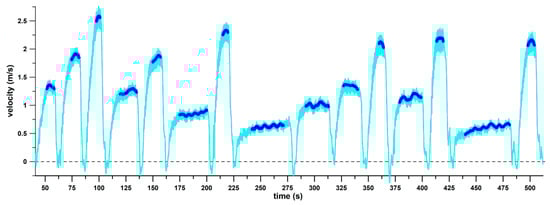 Velocity profile against time of a single experiment; the dark blue segments indicate a nearly constant translational velocity of a minimal acceleration within a ±0.1 m/s2 acceleration window; each of the 15 runs were carried out along the 30 m factory hall by changing the direction and turning after each run.