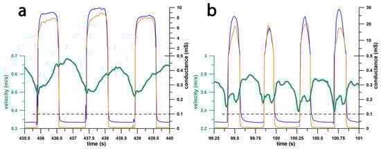 Slow (a) and fast (b) velocity profiles (green) against time; the push phase is identified from conductance data (blue and orange curves, right and left hand, respectively) larger than 0.1 mS (dashed line). Note that the resolution of the conductance scales changes at 0.5 mS.