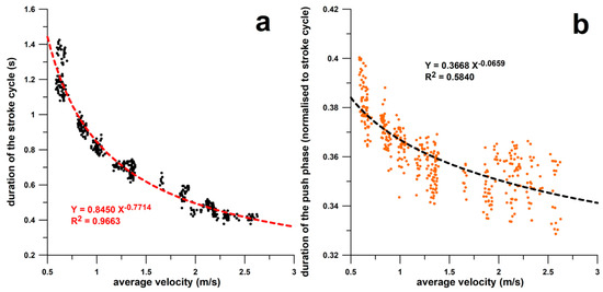 (a) Duration of stroke cycle against the average velocity; (b) duration of the push phase (normalised to the duration of the stroke cycle) against the average velocity. The data are fitted with a power function (dashed curves).