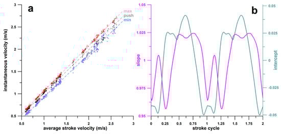 Method for calculating the average instantaneous velocity from the average stroke velocity: (a) Instantaneous velocity from the average stroke velocity; linear regression functions (dashed lines) at different stages of the stroke cycle: min = 0% of the stroke cycle (minimum velocity at the beginning of the push phase), push = 35.5% of the stroke cycle (end of push phase), and max = 60.5% of the stroke cycle (maximum velocity). (b) Slope and intercept of the linear regression functions against the stoke cycle.
