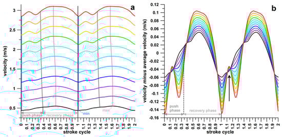 From the slopes and gradients of the regression function (Figure 6b), the average velocity profiles associated with 11 average velocities were calculated (Figure 7a). At average velocities less than 1.25 m/s, the instantaneous velocity increases continuously from the beginning of the push phase to a maximum speed (‘max’ in Figure 7a) well after the end of the push phase, and then decreases continuously to the minimum speed at the end of the stroke cycle. At an average velocity of 1.25 m/s, a flat speed section (Figure 7a,b) at 20% of the stroke cycle interrupts the continuously increasing velocity profile. At an average velocity greater than 1.25 m/s, the speed of this flat segment decreases between 15% and 25% of the stroke cycle, producing a significant peak at 15% of the stroke cycle (upward arrow in Figure 7b). Figure 8 shows the data of Figure 7b as a continuous 3D surface plot in top, front and iso views.