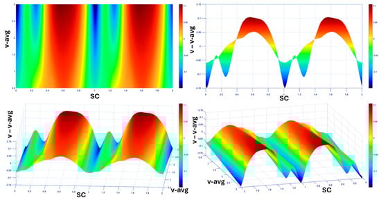 Continuous 3D surface plots in top (upper row left), front (upper row right) and iso views (bottom row); the velocity fluctuations (v—v-avg) in Figure 7b are plotted against the average velocity (v-avg) and the stroke cycle (SC) and the colour coding refers to the velocity fluctuations.