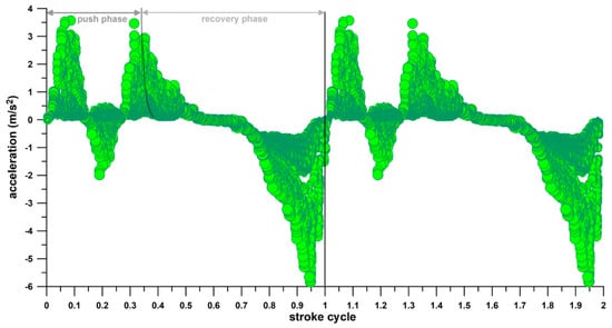Bubble plot of the raw acceleration data (64 k data; averaged across a window with a width of 1.88% of the stroke cycle) against the stroke cycle; the bubble size refers to the average velocity of the stroke cycle.