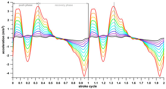 Acceleration profiles at different average velocities (0.5–3 m/s, at 0.25 m/s steps) against the stroke cycle; the colour coding is the same as in Figure 7.