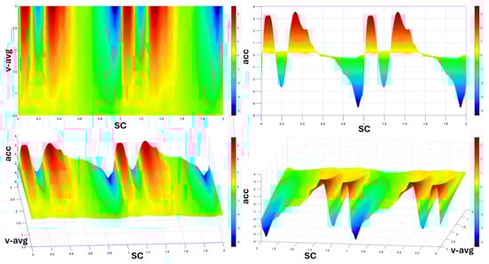 Continuous 3D surface plots in top (upper row left), front (upper row right) and iso views (bottom row); the acceleration (acc) of Figure 10 is plotted against the average velocity (v-avg) and the stroke cycle (SC) and the colour coding refers to the magnitude of the acceleration.