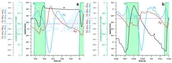 Wheel speed (v, converted to m/s), normalised conductance (G, 1 if >0.1 mS), and the horizontal (Fy) and vertical (Fz) inertial forces of the arms against the time, while the wheelchair was mounted statically on a force plate: (a) unconstrained freely spinning wheels; (b) wheel movement constrained by an ergometer. The dashed purple line indicates the zero-force level; Fz is shown as a net force as the system weight was set to zero during calibration of the force plate; the green shaded area corresponds to the push phase; accF = acceleration forward; accB = acceleration backward; decF = deceleration forward; decB = deceleration backward; accU = acceleration upward; accD = acceleration downward; decU = deceleration upward; decD = deceleration downward.