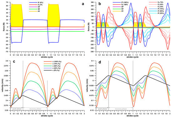 Accordingly, RF was approximately 12.9 N, and DF was approximately 7 N at an average speed of 2.5 m/s. The propulsive force PF required to counteract the two dissipative forces, while maintaining an average constant velocity, was 62 N at the plateau level during the push phase (Figure 13a). Figure 13b shows the force profiles of five different Fy levels (100%, 75%, 50%, 25%, 0% Fy). Figure 13c shows the corresponding velocity profiles related to the five different Fy levels. Reducing Fy had no influence on the propulsive force FP, which remained constant at 62 N. This result is not surprising and is actually logical since the force profiles satisfied the conditions of Equations (4)–(7).