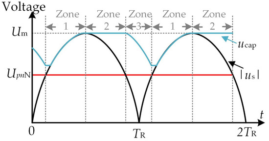 To meet the requirements of Equation (2), the rectifier output voltage |us| can be divided into three zones based on a single rectification period TR. Although the capacitance decreases, the motor input voltage always meets the rated voltage requirements. As depicted in Figure 2, where the amplitude of the ac power supply voltage is Um, the frequency of the ac power source is f, and the rectification period is TR. The logic for dividing the specific rectification period zone is as follows: Zone 1: |us| ≥ UpnN where |us| monotonically increases until Um. Zone 2: |us| ≥ UpnN where |us| monotonically decreases until 0. Zone 3: |us| ≤ UpnN.