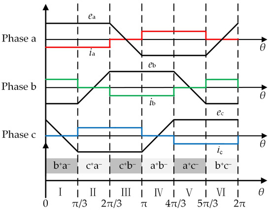 When the BLDCM operates in the braking mode, one electrical cycle is divided into six sectors, denoted by I to VI. The corresponding relationship between the ideal phase back-EMFs and the phase current waveform is shown in Figure 3. The conducting phase p and the conducting phase n take different values in different rotor sectors. For example, in sector I, p = b and n = a, which is the “b+a−” working state, while when the motor rotates to sector II, p = c and n = a, which is the “c+a−” working state. The conducting phase current in each sector is opposite to the direction of phase back-EMFs, resulting in a negative product. Therefore, the output braking torque of the motor is the electromagnetic torque Te, which is opposite to the direction of motor rotation, which is different from the electric mode. As shown in Equation (6), where Iave represents the average value of the phase current flowing through the conducting phase before commutation, the braking electromagnetic torque is expressed as: