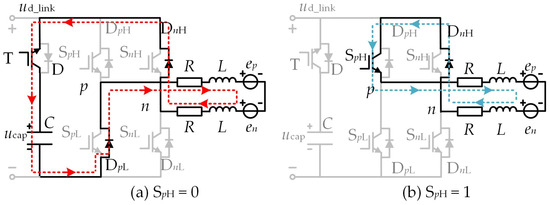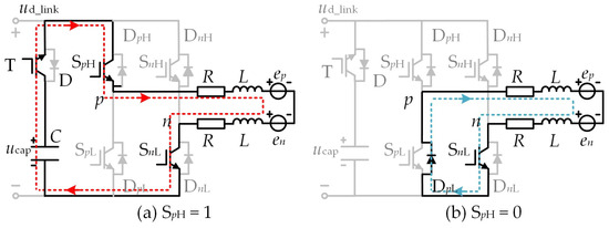 When SpH = 0, under the action of line back EMF epn and inductor voltage, the positive conducting phase current ip flows through the antiparallel diodes DpL and DnH and finally flows into the capacitor through the dc-link switch transistor T. At this time, the capacitor stores energy, forming another current flow path, as shown in Figure 4a. During the normal conduction period of the BLDCM, in order to simplify the analysis, we ignore the effect of the antiparallel diode freewheeling of the nonconducting phase, and the line voltage equation of the two-phase winding conduction can be expressed as: