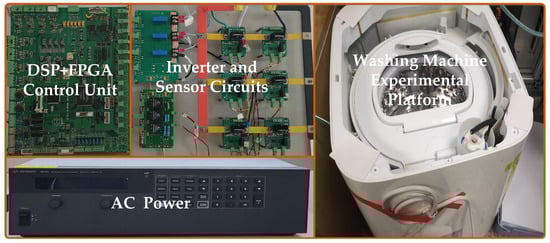 In order to verify the feasibility of the proposed method above, a washing machine with a washing weight of 1 kg is built as an experimental platform, as shown in Figure 6. The relevant parameters of the BLDCM system are calculated, and the parameters are listed in Table 1. The schematic diagram and flowchart of the proposed anti-overvoltage braking torque control method are shown in Figure 7. As shown in Figure 7a, i denotes the non-commutated phase current, which is used as the feedback value for the PI current loop control. The proportional coefficient P of the PI controller is 7.0, and the integral coefficient I is 0.09.