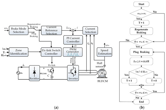 In comparison to the electric mode, the braking mode represents another crucial operational state of the motor. During braking mode, the motor conducting phase current is in opposition to the phase back electromotive force (back-EMF), thereby generating an electromagnetic torque in the opposite direction of motor rotation. When the BLDCM operates in the electrical braking mode, the available electrical braking modes include regenerative braking, dynamic braking, and plug braking. Regenerative braking is a process whereby the mechanical energy of the motor system is converted into electrical energy and subsequently fed back to the energy storage elements of the power supply (e.g., batteries or supercapacitors) via a hardware circuit [15,16,17,18,19]. Dynamic braking is a technique that involves connecting switches and braking resistors in series in the dc-link circuit. This is used to prevent the dc-link voltage from exceeding a threshold value set by the control system. When the voltage reaches this threshold, the switch is turned on, and the braking resistor absorbs the energy from the motor. This helps slow down the motor and prevent any damage from the excessive dc-link voltage. During plug braking mode, the motor can reverse the input voltage or introduce specific inverter control patterns to change the motor’s conducting phase sequence, generating a braking torque in the opposite direction of the motor rotation and achieving a rapid drop in motor speed [20].