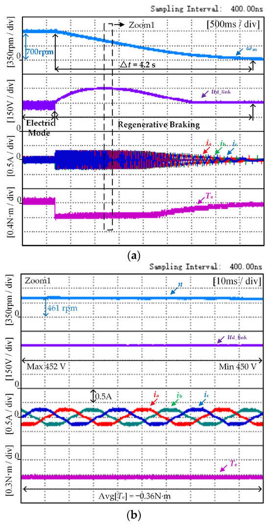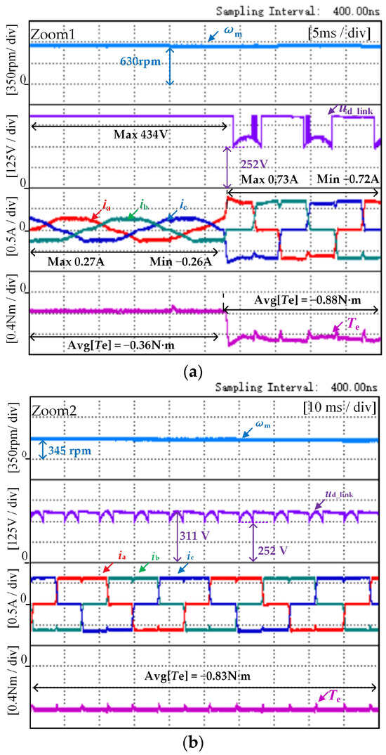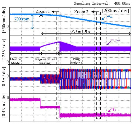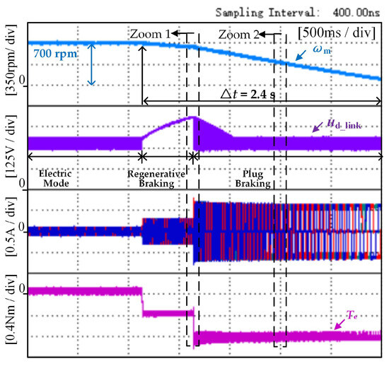 Figure 9 shows the experimental results of the proposed method of the washing machine under no-load conditions, in which the waveform graphs from top to bottom are the speed, three-phase current, dc-link voltage, and electromagnetic torque, respectively. During regenerative braking mode, the brake torque reference of the washing machine is −0.35 N·m. With the progress of regenerative braking, when the washing machine control system recognizes the speed ωc and the braking mode changes to plug braking, the reference of plug braking torque is −0.83 N·m, and the modulation pattern is ON_PWM. As shown in Figure 9, three operating modes exist in the system: electric mode, regenerative braking, and plug braking. At first, the electric mode adopts a control method for the BLDCM drives with reduced capacitance, after which the control mode of the washing machine changes to regenerative braking. At the same time, once the system recognizes the rotational speed as ωc, it will switch to the plug braking mode to consume the stored energy of the capacitor during the regenerative braking process and avoid overvoltage of the capacitor.