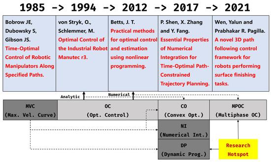 For the latter, since O. V. Stryk et al. proposed a numerical solution framework for OC problems, numerous methods have been derived. Z. Xiong et al. integrated the framework with a Functional Mock-up Unit (FMU), accomplishing optimal PTP TP for six-axis robotic manipulators [21]. However, the above technology is limited to solve the PTP TP problem. In response to this situation, J. T. Betts et al. published a path-constrained trajectory optimization method based on DC methods in 1993 [22], which may provide a way to solve the specified path TP problem. Furthermore, Betts summarized a general technology framework for solving OC problems in a book in 2010 [23]. Simultaneously, Victor M. Becerra implemented the program PSOPT based on the book and published it in the open-source community [24]. Afterwards, M. Kelly published an introduction in 2016 to assist others in solving TP problems using DC methods, including the utilization of multiphase direct collocation (MPDC) methods [10]. As a result, a brand-new method inspired by Kelly for solving the specified path trajectory planning problem came out; Y. Wen improved this MPDC method and successively accomplished a novel 3D path following a control framework for a robot [11] and a path-constrained and collision-free OTP scheme [25]. A simple literature review is shown in Figure 1.