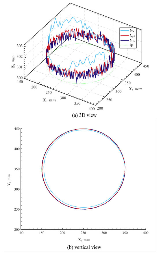 Then, a software for large-scale nonlinear optimization named Interior Point OPTimizer (IPOPT) can be applied to solve (12)–(20). In addition, and have to be set to enable Algorithm 1. It is known that the location accuracy of ROCR6 is 0.02 mm. Furthermore, we can find a linear relationship between the path discretization error in the PP process and that in the TP process, as indicated by (64). A rough optimization without constant arc velocity is used to define m/s. Then, we have the following:
