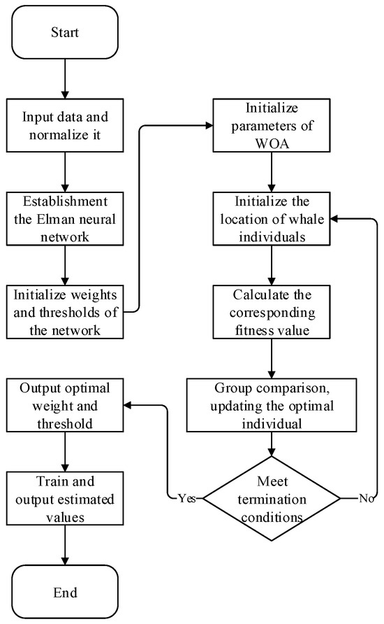 - Step 4: Introduce the WOA to optimize the network. Continuously iterate using the WOA to adjust the weights and thresholds of the ENN. Repeat this process until the weights and thresholds meet the specified tolerance range. Terminate the loop at this point and proceed to the next step.