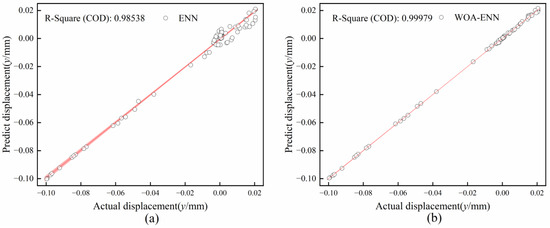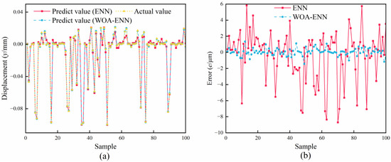The accuracy of the neural network directly affects the credibility of subsequent research. Therefore, it is essential to validate and evaluate the trained neural network. By comparing the differences between the output values of the two networks and the actual values, the accuracy of the networks can be verified. Due to the similarity in displacement along the x-axis and y-axis directions, to reduce variables, we only select displacement along the y-axis as the output. Figure 5 illustrates the comparison of the predicted values of both networks with the actual values. Figure 5a shows the comparison between the predicted values and the actual values of the two networks, while Figure 5b displays the errors between the predicted values and the actual values for both networks. It can be observed from the figures that the predicted values of both methods are very close to the actual values, indicating high accuracy for both. However, from Figure 5b, it can be seen that the error of ENN mostly ranges from 4–8 μm, whereas the error of WOA-ENN remains within 2 μm. Clearly, the error of the latter is significantly smaller than that of the former. The results demonstrate the feasibility of the neural network and validate the precision of the WOA.