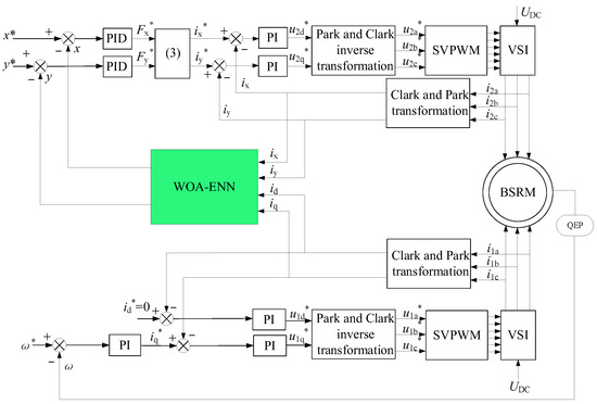 The trained WOA-ENN model from the previous section was integrated into the MATLAB/Simulink environment to construct a displacement sensorless simulation model for the BSRM. The control diagram is illustrated in Figure 7. The working steps of the suspension winding control system are described as follows. The current signals (id, iq, ix, iy) collected from the two windings are input into the WOA-ENN module. The predicted rotor displacement signals (x, y) obtained from the displacement sensorless technique serve as negative feedback control signals, which are compared with the desired displacement signals (x*, y*). The resulting error signals are transformed by a PID controller into suspension force signals (Fx*, Fy*). The current signals ix* and iy* of the suspension winding can be obtained through force/current conversion (Equation (3)). These signals are compared with the feedback current values ix and iy of the suspension winding. The resulting error signals are then converted by a PI controller into voltage signals, followed by Park inverse transformation and Clark inverse transformation to obtain the input voltages (u2a*, u2b*, u2c*) for the SVPWM module, thereby driving the suspension winding.