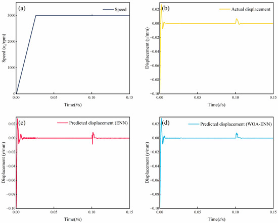 Comparing Figure 8b–d, it can be observed that the trends of the three curves were generally consistent throughout the entire simulation process. This indicates that both the ENN and WOA-ENN methods are capable of predicting rotor displacement. However, at t = 0.1 s, there was a noticeable distortion in the ENN waveform, while the WOA-ENN waveform remained unaffected. This is attributed to the inherent limitations of ENN, such as poor convergence and robustness in handling nonlinear time series problems, whereas the latter, benefiting from the optimization of WOA, does not exhibit such pronounced deficiencies.