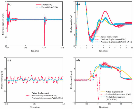Throughout the simulation process, the WOA-ENN can accurately predict the displacement information of the rotor. Compared with traditional ENN, it has a small error and fluctuation range, proving that the proposed method is accurate, implementable, and has strong anti-interference ability.