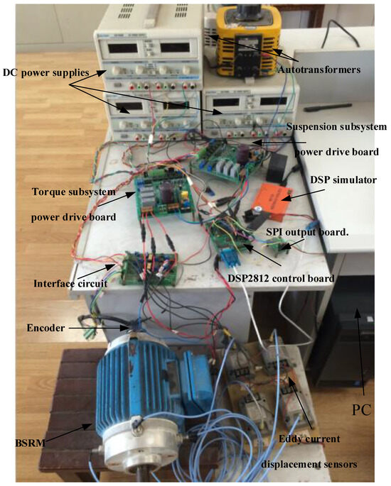 To validate the correctness of the simulation results, an experiment platform was established. The experimental parameters and simulation parameters were consistent. The BSRM experimental platform was built, as shown in Figure 10. It mainly comprised the BSRM, power drive boards, power supplies, and a DSP controller. Because the actual displacement of the BSRM could not be directly obtained, we assumed that the values measured by the displacement sensor were the true data, while the values obtained after processing by the neural network were the predicted values. The displacement sensor used in this experiment was the QH8500 model of an eddy current sensor. This type of sensor is a non-contact linear position measurement device, known for its high resolution, strong anti-interference capability, and fast response speed. An oscilloscope was used to display the displacement signal detected by the displacement sensor and the displacement signal predicted by the neural network, and they were analyzed.