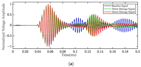 The Lamb wave detection experiments were carried out on both non-damaged and damaged specimens, and the resulting non-damaged and damaged signals are shown in Figure 2a and Figure 2b, respectively. The scattered wave signal obtained by subtracting the baseline signal from the damage signal is expressed as