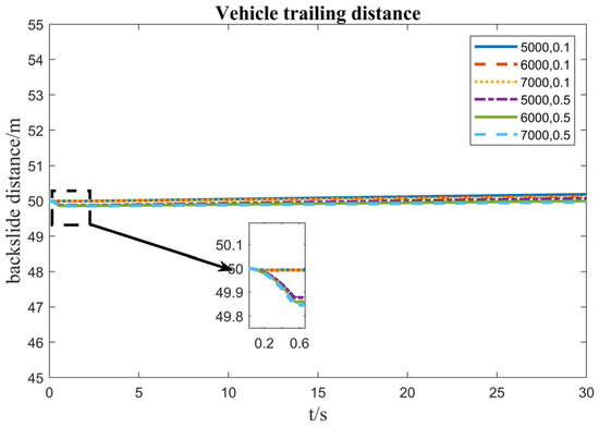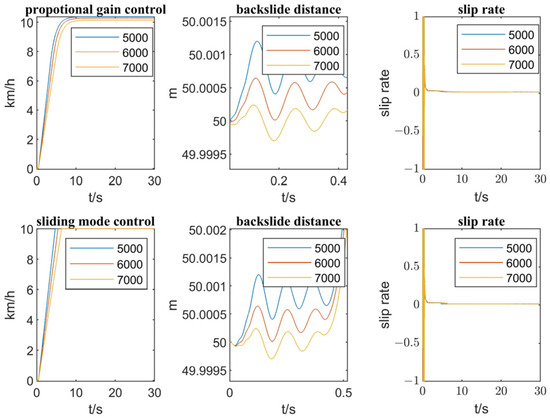 From the previous section, the proportional gain control method based on the back-slip speed matching torque is calibrated to follow the target speed when the gradient is 5° and 10° and the mass is 4455 kg, 5455 kg, 6455 kg, and 7455 kg to ensure the control performance of the vehicle, but the control effect of the control method for the un-calibrated gradient and mass needs to be further explored, and for this reason, the gradient is set to be 3°, 6°, and 12°, and the mass to be 5000 kg, 6000 kg, and 7000 kg in this section. For this reason, in this section, the slope is set to be 3°, 6°, and 12°, and the mass to be 5000 kg, 6000 kg, and 7000 kg, respectively. Since the pure PI cannot adaptively adjust the motor torque with the change of slope and mass, this section will not discuss this method and will only conduct a comparative study on the proportional gain control based on the back-slip speed matching torque and the sliding mode control based on the back-slip speed matching torque. The initial position of the vehicle is set to 50 m, and now the two methods are used for a 3° ramp with 5000 kg, 6000 kg, and 7000 kg.