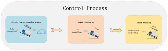 The ramp start process in the starting process is slow and visible as a quasi-static process. In order to simplify the problem study, the vehicle will be subjected to air resistance, which is ignored; the vehicle is subjected to the force for the driving force, gravity, as shown in Figure 1. When the vehicle starts on the ramp, the gravity component is converted into ramp resistance, so that the vehicle has a tendency to skid back along the ramp [20]. The traditional driver’s operation will be conducted by stepping on the brakes and, at the same time, stepping on the gas pedal. The driving force is greater than the braking and braking forces. Increase the driving force so that the driving force is greater than the ramp resistance and braking force, and when the driving force is at the critical point of breaking through greater than the ramp resistance and braking force, the vehicle will shake violently, and the driver releases the brake pedal, and the vehicle accelerates uphill to complete the ramp start. The self-driving car cannot accurately feel the shaking of the vehicle and measure the weight of the vehicle and cannot have strong self-regulation ability, so we propose a ramp start control method based on the parking moment corresponding to the backward glide speed, the vehicle matching the parking moment during the ramp start, and the use of the sliding mode controller to complete the tracking of the specific speed.