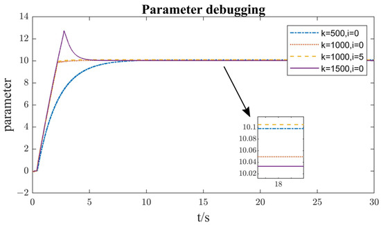 As commercial vehicles are in the process of transporting materials, the vehicle load will change, the vehicle does not have additional sensors to sense the vehicle load, the traditional PID regulation cannot meet the vehicle performance requirements, the PID controller cannot regulate the vehicle speed based on the existing information, there will be a speed error, and the vehicle load is too large in the case of the vehicle, which even causes back skidding. Based on the above problems, the standing hill moment calculated by the sliding mode controller in the previous section will be Based on the above-mentioned problems, the feed-forward proportional controller is introduced into the feed-forward proportional controller to solve the problem of the large distance of the car skidding. In order to obtain more accurate speed control, the gain parameters are matched, and different gain parameters are matched for the calculated hill moments to obtain the optimal control effect. The vehicle loading is changed within a certain range, and the gain parameters are matched for the four vehicle masses. The vehicle mass is divided into 4455 kg, 5455 kg, 6455 kg, and 7455 kg, and the gain parameters are matched for the four vehicle masses, and the time-domain characteristics such as rise time and overshoot are taken into account when choosing the gain, as shown in Figure 8.
