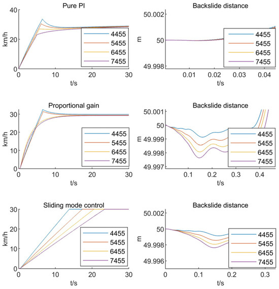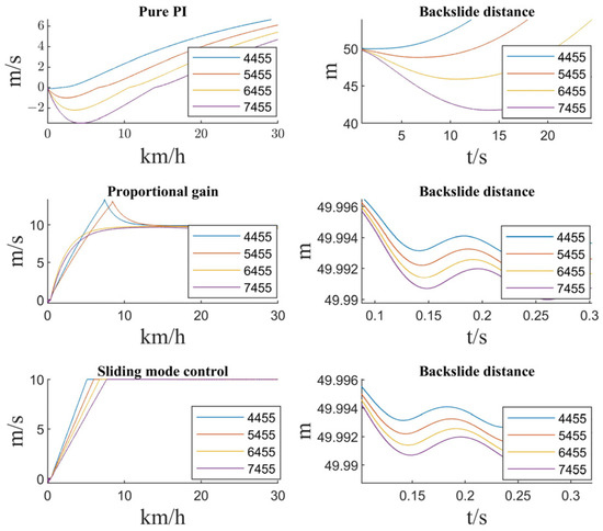 In order to make the speed tracking effect better, the proportional gain coefficient is the parameter derived from the pre-calibration of the gradient of 5°, 7°, and 10°, and the mass of 4455 kg, 5455 kg, 6455 kg, and 7455 kg. In this section, the pure PI controller, the ramp start variable proportional control, is used for comparison with the sliding mode ramp start control. Setting the different vehicle masses as 4455 kg, 5455 kg, 6455 kg, and 7455 kg, a simulation test is carried out, and the effects of pure PI control, proportional gain control, and sliding mode control are shown in Figure 13.