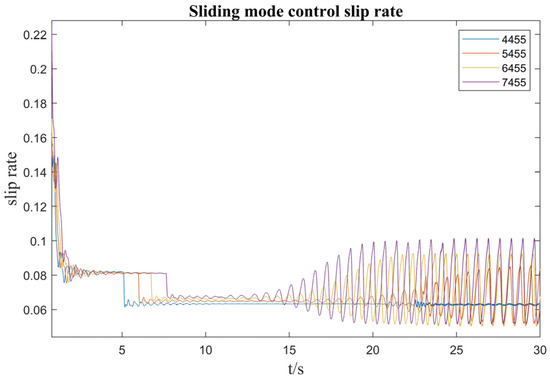 As shown in Figure 15 and Figure 16, it can be seen that when using the proportional gain control method based on the back-slip speed matching torque for the 4455 kg and 5455 kg vehicles, the driving force exceeds the adhesion force, the wheels slip, and the slip rate is more than 90% in the first 5 s, which makes the vehicle driving unstable, whereas when using the sliding-mode control method based on the back-slip speed matching torque for the 4455 kg, 5455 kg, 6455 kg, and 7455 kg vehicles, the driving force of the vehicle is less than the adhesion force and the slip rate is less than 20%, which ensures stable driving of the vehicle.