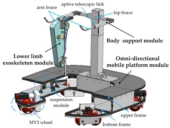 This paper introduces a new omnidirectional lower limb rehabilitation robot that has both good center-of-gravity control and the stiffness and hardness of an exoskeleton. During patient training, rehabilitation robots can provide support and boost for patients. In addition, the proposed rehabilitation robot can move in any direction along the plane and at the same time realize exoskeleton assistance and guide the patient to ideally complete the gait rehabilitation training. The rehabilitation robot is mainly composed of three parts: (1) an omnidirectional mobile platform module, (2) a lower limb exoskeleton module, and (3) a body support module. The overall structure is shown in Figure 1.