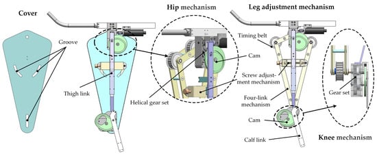 The purpose of designing a leg adjustment mechanism is to meet the physiological characteristics of human beings and the needs of different patients so that it can be adjusted according to the height and body shape of the user. The structure is mainly composed of a four-link mechanism, a screw adjustment mechanism, a timing belt, and a cover. The adjusting mechanism involves a two-way lead screw, which is connected to the four-link mechanism through the lead screw nut. When the nuts are twisted in different directions, the rotating pairs act at the junction of the three grooves on the slideway trajectory on the cover. At this time, the four-link mechanism will deform, thus changing the center distance of the synchronous pulley, to achieve the purpose of adjusting to the leg length of different people.