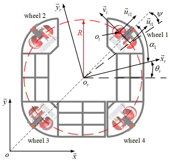 The kinematic model of the platform adopts the velocity equation method, which is simplified to reduce the complexity of the equation and establish the equation under ideal conditions. It is assumed that the wheels of the platform do not slip during movement, and the center of mass of the robot coincides with the geometric center. As shown in Figure 3, the world coordinate system fixed on the ground and the kinematic coordinate system fixed at the geometric center of the robot are established. The coordinate system represents the position of the contact point between each MY3 wheelset on the platform and the ground.