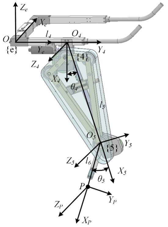 The lower limb exoskeleton module is designed with a hip and knee mechanism. By establishing the kinematic model of the lower limb exoskeleton module, the correspondence between the hip drive motor and the lower limb posture can be obtained. The kinematics of the lower limb exoskeleton module are solved by using the modified Denavit–Hartenberg (MD-H) [29] method to construct the base coordinate system {e} and the joint coordinate system {4}, {5}, as shown in Figure 4. P indicates the end of the joint. The hip brace and lower limb exoskeleton module are simplified into a three-link mechanism. The corresponding coordinate system is shown in Figure 4.
