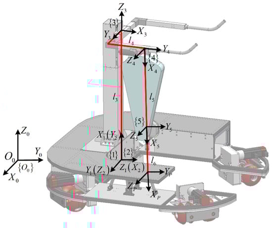 In the process of establishing the overall kinematics, the platform and the lower limb exoskeleton module can be considered as a whole. The world coordinate system is established on the ground, and the moving coordinate system , is set at the center of the trolley. The rotational coordinate system {3} is set on the support column. Thus, four coordinate systems , , and are defined. In Figure 5, there are a total of six coordinate systems, which have different names.