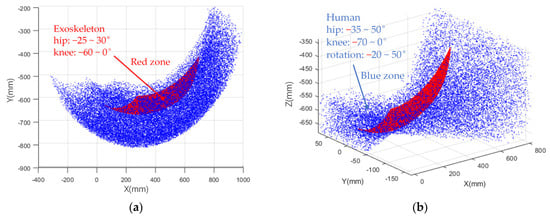According to the gait theory, it is known that the swing angle of the hip joint of normal people ranges from −25° to 30°, and the swing angle of the knee joint ranges between −60° and 0°. Based on these data, the motion space of the outer skeleton lower limb module can be simulated and analyzed to determine the motion space required for the swing of each joint when working. The motion space of the robot can be obtained by using software to build a simulation program, as shown in Figure 6. To avoid damaging the robot or the patient, the working range must be within the movement space. The blue part of Figure 6 represents the space required for the movement of lower limbs during normal human gait, and the red part represents the space required for the movement of the exoskeleton module. It can be concluded that the range of space required for the movement of the exoskeleton module meets the corresponding requirements.