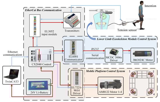 The lower limb exoskeleton module uses 1 FAULHABER motor, 1 MCDC3006RS encoder, and 1 EL6001 serial port module, which communicates with the controller through RS232(The equipment comes from FAULHABER, Guangzhou, China.). The human movement intention and the contact force are collected with a tension sensor with a range of 0–30 kg and a sensitivity of 2 mV. The transmitter converts the contact force into a current analog signal and transmits it to the controller through the corresponding EL3052 module, and the current analog acceptance range is 4–20 mA.