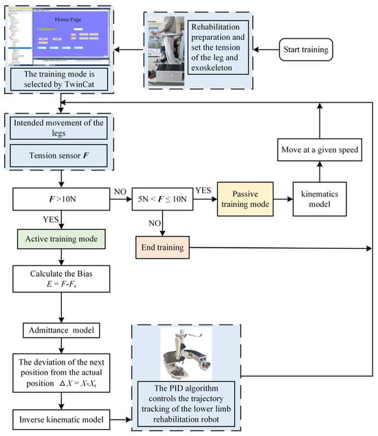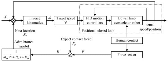 Admittance control typically consists of an inner loop position controller and an outer loop admittance controller, with the inner loop using a PID control [32]. The passive and active training control strategies of the lower limb exoskeleton rehabilitation robot are shown in Figure 9. The admittance controller block diagram design is shown in Figure 10.