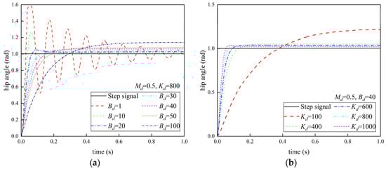 The admittance control algorithm was used to control the swing of a single joint, and the initial angle of the hip was 0 rad. The relevant parameters of the prototype were obtained from [12] and actual measurements. Experiments were carried out by varying the damping parameters separately and the stiffness parameter to obtain the step response, and the curve is shown in Figure 11.
