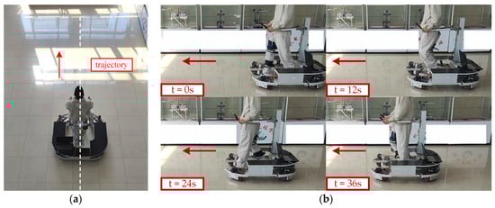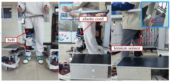 Referring to the walking speed of the exoskeleton in passive mode, the initial speed of the robot in the admittance control mode was set to 0.21 m/s. Before the start of the prototype experiment, one healthy human subject (male, 24 years old, height 178 cm, weight 67 kg) wearing an exoskeleton for the walking action test was asked to walk a 3 m distance on flat ground. The wearing of human devices and sensors is shown in Figure 12. The affected lower limb of the volunteer was tied to the lower limb exoskeleton with a black belt. The blue elastic cord acted as a bridge between the person and the tension sensor, which could transmit the tension change generated when the person moved. Then, the system was activated, and only the control in the state of linear motion was considered in this experiment.