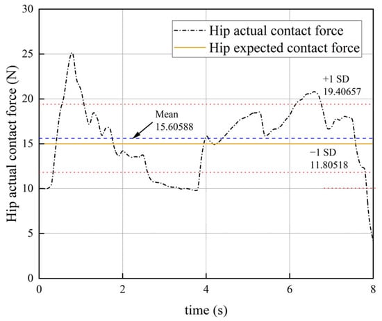 During the experiment, there was a beginning phase, an intermediate phase, a deceleration phase, and an end phase. The unilateral lower limb exoskeleton module followed the movement from standing to leg lift to standing in the repetitive cycle of the human lower limb. The contact force measured with the tension sensor during the experiment is shown in Figure 14. The trajectory of the platform is shown in Figure 15.