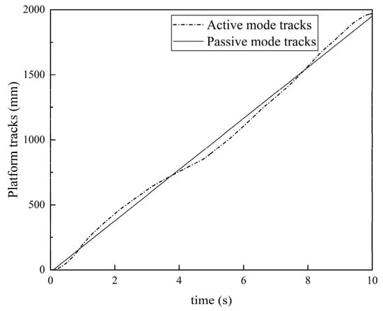 As can be seen from the change in the contact force in Figure 14, the contact force increased sharply at the beginning of the experiment, which is due to the use of bungee cord connection measurement between the human body and the exoskeleton. When a sudden change in force occurred, the connecting rope underwent a huge deformation, resulting in a surge in contact force. After a short period, the contact force stabilized at the average value of 15.6 N, which is close to the expected contact force of 15 N. Figure 15 shows the change in the trajectory of the moving platform during movement. The change in the trajectory of the mobile platform is related to the speed of human lower limb movement in the active training mode, and the linear change in the trajectory is relatively stable in the passive training mode.