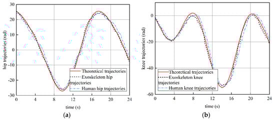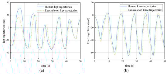 The hip and knee trajectory tracking data were collected during the experiment. Exoskeleton data of the human lower limb in the passive assistance stage are shown in Figure 16.