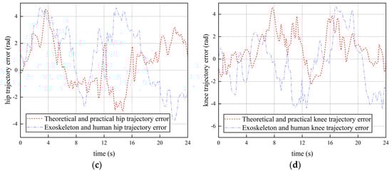 Exoskeleton−assisted trajectories in passive mode: (a) hip trajectory; (b) knee trajectory; (c) hip trajectory errors; (d) knee trajectory errors.