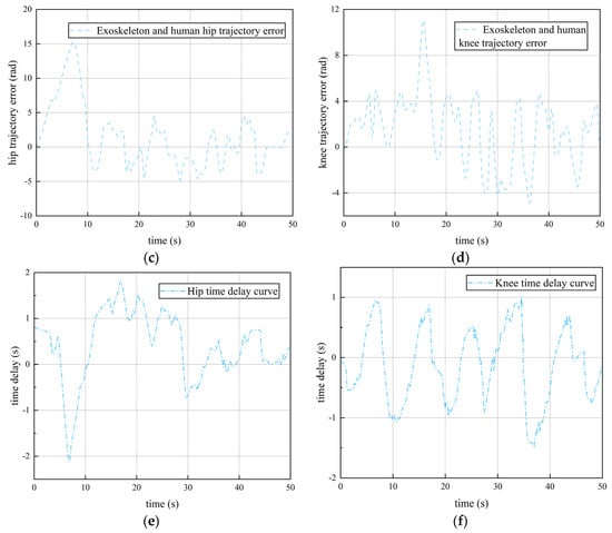 Admittance −controlled exoskeleton trajectories in active mode: (a) hip trajectory; (b) knee trajectory; (c) hip trajectory error; (d) knee trajectory error; (e) hip time delay; (f) knee time delay.