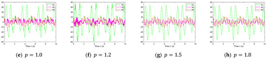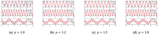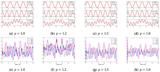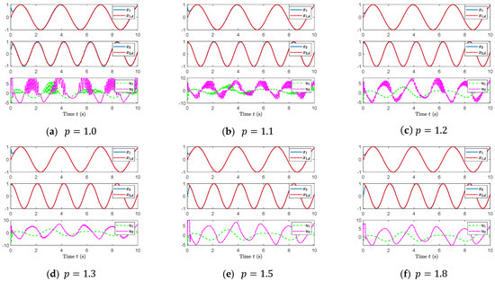 Figure 2 shows the control performance results based on the SNN controllers with different values chosen . We can evidently observe that, the proposed SNN-based method is capable of making the nonlinear control system’s state vector converge to the specified trajectory elegantly with different parameters . When the parameter increases, fewer oscillations occur in the controller curves, which may reveal that optimization with a larger can produce smoother control inputs as the convexity situation might be different. As ranges from close to 1 to 2 within the norm, where 1 ≤ p ≤ 2, the convexity and sparsity of the norm undergo transformations. As approaches 1, the convexity of the norm becomes more ronounced. As gradually increases towards 2, the norm function’s convexity diminishes. The norm function becomes less inclined to promote sparsity as p approaches 2, indicating a decrease in sparsity. In summary, as varies from close to 1 to 2 within the norm, the convexity gradually diminishes while the sparsity decreases.
