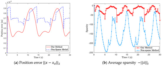 In this use case, the proposed SNN with was further applied to the kinematic control of the manipulator, whose dynamics are expressed as a nonlinear affine system, i.e., [53,54], where x represents the end-effector’s position, denotes the Jacobian matrix, and denotes the joint angle. A circular trajectory with a radius of 0.15 m is set as the specified path for the end-effector to track. For comparative purposes, non-sparse neural network [55]-based control methods are adopted for the same tracking task with the same parameter and the same initial joint angle . In Figure 5, we present a performance comparison between the SNN and the non-sparse neural network-based control method. Figure 5a shows that the tracking error magnitudes of the position by the two methods are within the same scale range of 10−3 m; however, the average sparsity of our proposed method is enhanced, as demonstrated by Figure 5b. The findings indicate that, at an equivalent level of control precision, the proposed method, SNN, attains more effective sparse solutions.