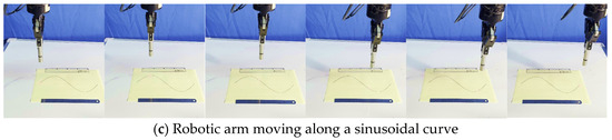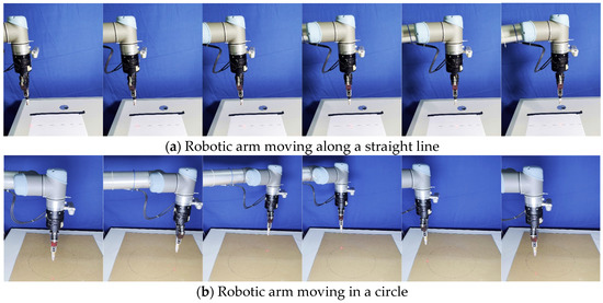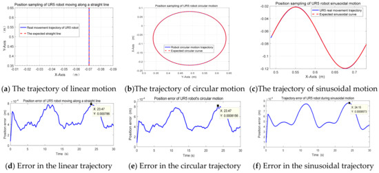 (1) When guiding the robot to move in a straight line, we generate a random trajectory and direct the robot to follow this predetermined path. The initial position of the straight line trajectory in this experiment is , and the final position is . (2) We randomly select the center point and set the radius as , when controlling the robot to move along a circular trajectory. (3) We randomly set the starting point , with an amplitude of 0.05 and a unit period of 0.1256, to drive the robot’s end to travel along a sinusoidal trajectory. The end point of the sinusoidal trajectory is . The experiment imposed a maximum limit of 0.1 m/s for the robot’s final velocity and 0.1 m/s2 for its acceleration. Figure 7 shows the end movement of the robot.